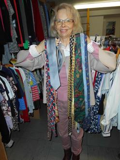 Total beschlipst präsentiert sich hier Angelika Schmidt vom AWO-Modetreff. Krawatten für Weiberfastnachts-Attacken gibt es bei uns für 50 Cent das Stück.
