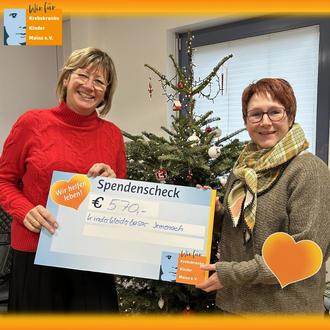 Von diesen Einnahmen wurden 570 Euro an das Elternhaus des Vereins "Krebskranke Kinder Mainz e. V." gespendet. Die Übergabe dieser Spende erfolgte im Dezember durch Tina Röder vor Ort in Mainz. Der Verein unterstützt krebskranke Kinder und deren Familien und bietet ihnen eine wichtige Anlaufstelle in schwierigen Zeiten.