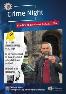 Erstmals veranstaltet die Polizei Rheinland-Pfalz am Freitag, 22. November 2024, unter der Schirmherrschaft von Innenminister Michael Ebling eine landesweite "Crime Night".