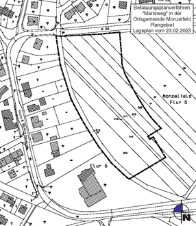 Der Planbereich betrifft derzeit landwirtschaftlich genutzte, unbebaute Flächen. Das Plangebiet ist nördlich des Bürgerhauses und südlich der Kreisstraße 94 gelegen. Es sind folgende Parzellen von der Aufstellung des Bebauungsplans betroffen: Gemarkung Monzelfeld, Flur 5, Flurstücke 310/24, 350, 349, 348, 347, 346/1, 345/1, 344/1, 343/1 und 342/1 (jeweils teilweise). Zusätzlich sind Ausgleichs- und Ersatzmaßnahmen auf den Parzellen Gemarkung Monzelfeld, Flur 8, Flurstücke 160, 161 tlw, 227 tlw festgesetzt. Der künftige räumliche Geltungsbereich des Bebauungsplans ergibt sich aus den besonders abgedruckten Kartenausschnitten (innerhalb der schwarz-unterbrochenen Linie).