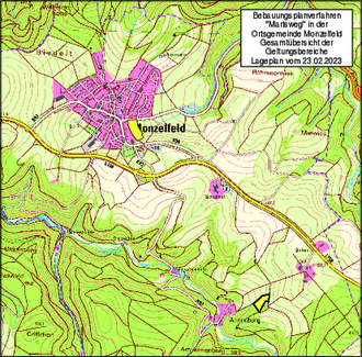 Der Gemeinderat der Ortsgemeinde Monzelfeld hat am 28.04.2022 in öffentlicher Sitzung beschlossen, gemäß § 2 Abs. 1 Baugesetzbuch (BauGB) einen Bebauungsplan aufzustellen. In gleicher Sitzung wurde der Planentwurf gebilligt sowie die frühzeitige Beteiligung der Öffentlichkeit nach § 3 Abs. 1 BauGB beschlossen. Die frühzeitige Öffentlichkeitsbeteiligung gemäß § 3 Abs. 1 BauGB fand im Zeitraum vom 20. Mai 2022 bis einschließlich zum 24. Juni 2022 in Form einer Planauflage bei der Verbandsgemeindeverwaltung Bernkastel-Kues statt. Das Ergebnis der frühzeitigen Öffentlichkeitsbeteiligung kann auf der Homepage der Verbandsgemeindeverwaltung Bernkastel-Kues eingesehen werden. In der öffentlichen Sitzung vom 23.02.2023 hat der Gemeinderat beschlossen, die Planung zu billigen und die öffentliche Auslegung gemäß § 3 Absatz 2 i.V.m. § 4 Absatz 2 BauGB durchzuführen. Maßgebend sind die Planunterlagen in der Fassung von 23.02.2023.