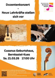 Die Musikschule des Landkreises Bernkastel-Wittlich lädt am Samstag, 21. März 2026, um 17:00 Uhr zu einem besonderen Konzerterlebnis in das Cusanus-Geburtshaus in Bernkastel-Kues ein. Der Eintritt ist frei.