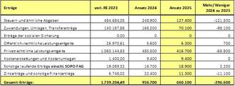 Die Verschlechterung beträgt insgesamt 426.100 €. Dies ist auf den Wegfall der Schlüsselzuweisungen, dem Einbruch bei der Gewerbesteuer und die höheren Umlagen (Steuerkraft 4.Q.2023) zurückzuführen.