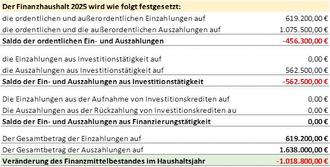 Der Finanzhaushalt hat bei den ordentlichen und außerordentlichen Einzahlungen und Auszahlungen einen negativen Saldo in Höhe von 456.300 € und weist, unter Berücksichtigung der ordentlichen Tilgung in Höhe von 0,00 €, somit eine negative Freie Finanzspitze von ebenfalls 456.300 € aus.
