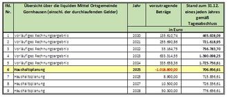 Dies ist auf die hohen Gewerbesteuereinnahmen im 4. Quartal 2023 zurückzuführen. Dadurch stieg die Steuerkraftzahl erheblich. Dadurch bedingt erhält die OG Gornhausen im Jahre 2025 keine Schlüsselzuweisungen und muss wesentlich höhere Umlagen an Land, Kreis und Verbandsgemeinde zahlen.