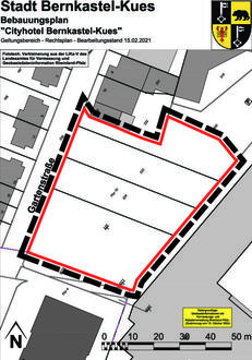 Der Stadtrat Bernkastel-Kues hat in seiner Sitzung am 04.03.2021 den Bebauungsplan „Cityhotel Bernkastel-Kues“ gemäß § 10 Abs. 1 des Baugesetzbuches (BauGB) in der aktuell geltenden Fassung als Satzung beschlossen, nachdem zuvor das erforderliche Verfahren durchgeführt wurde. Maßgebend sind die Planzeichnung, die textlichen Festsetzungen, die Begründung und der Umwelttechnische Bericht in der Fassung von Februar 2021.