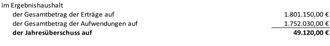 Im Ergebnishaushalt 2025 sind der Gesamtbetrag der Erträge mit 1.801.150,00 € und der Gesamtbetrag der Aufwendungen auf 1.752.030,00 € und einem Jahresüberschuss von 49.120,00 € geplant. Demnach ist der vorliegende Ergebnishaushalt ausgeglichen.