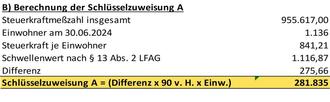 Die Schlüsselzuweisung A stellt allgemein eine wichtige Einnahmequelle für Ortsgemeinden dar, deren so genannte Steuerkraftmesszahl (nach § 17 LFAG) weniger als 76 v. H. der in Euro je Einwohner errechneten landesdurchschnittlichen Steuerkraftmesszahl (Schwellenwert) beträgt. Die maßgebliche Steuerkraftmesszahl der Ortsgemeinde ist gegenüber dem Vorjahr um 239.041,00 € auf 955.617,00 € gefallen. Der Schwellenwert für die Ermittlung der Schlüsselzuweisung A beträgt 1.116,87 € (2024 = 1.122,65 €) je Einwohner, die Steuerkraft je Einwohner beträgt in Longkamp 841,21 € je Einwohner. Somit erhält die Ortsgemeinde Longkamp Schlüsselzuweisung A in Höhe von rd. 281.800 € (2024 = 59.400 €) und Schlüsselzuweisung B in Höhe von rd. 18.500 € (2024 = 11.770 €).