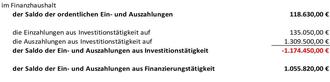 Im Finanzhaushalt (§ 1 Ziffer 2) belaufen sich die Festsetzungen auf:
