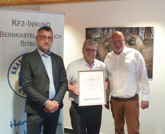 In dieser Zeit war er auch Delegierter zur Kreishandwerkerschaft Mosel-Eifel-Hunsrück-Region und insgesamt 16 Jahre engagierte er sich als Delegierter zum Kfz-Gewerbe Landesverband Rheinland-Pfalz. Obermeister Rainer Ferres und Hauptgeschäftsführer Dirk Kleis überreichten ihm feierlich die Ernennungsurkunde. „Engagierte Meister wie Karl Hans Kröfges sind das Fundament unserer Innungsorganisation“, betonte Kleis.