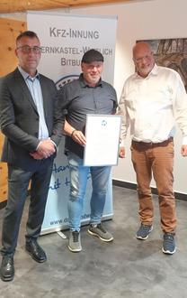 Harald Edwin Herlach (Mitte) blickt auf 25 Jahre Meisterwürde zurück. Die Silberne Meisterbriefurkunde wurde ihm von Obermeister Rainer Ferres (links) und Hauptgeschäftsführer Dirk Kleis überreicht. Foto-Autor: Kfz-Innung Bernkastel-Wittlich-Bitburg