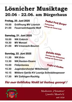 Wir, der Musikverein „Heimattreu“ Lösnich, freuen uns, Sie in diesem Jahr wieder zu einem Wochenende voller Blasmusik in unser Dorf einladen zu dürfen. Mit einem stimmungsvollen Konzert eröffnen wir die Musiktage am Freitag um 19:00 Uhr. Abgerundet wird der Freitagabend durch den Auftritt der Feuerwehrkapelle Wolf. Bei hausgemachten Pulled Pork Burgern, Bier und Wein können Sie die abwechslungsreichen Klänge ausgiebig genießen.