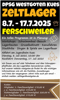 Die Pfadfinder der DPSG Westgoten Kues schlagen vom 08. Juli bis zum 17. Juli in Ferschweiler ihre Zelte auf. Die Planungen sind soweit abgeschlossen und es gibt wieder ein super tolles Programm. Wir haben noch einige Plätze frei und wer gerne mit uns 10 Tage in der freien Natur erleben möchte ist herzlich Willkommen.