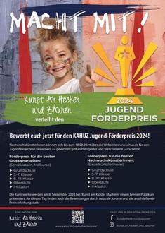 Der Verein Kunst an Hecken und Zäunen e.V. lädt auch in diesem Jahr wieder junge kreative Köpfe ein, ihre besten Kunstwerke für die Vergabe des Jugend-Förderpreises 2024 zu präsentieren. Es gibt tolle Geld- und Sachpreise zu gewinnen. Die Teilnahme ist kostenfrei. Bewerbungsschluss ist der 18. August 2024.