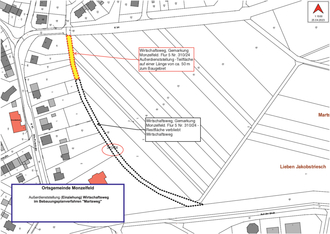 Die Fläche des Wirtschaftsweges Gemarkung Monzelfeld, Flur 5 Flurstück 310/24 wird auf einer Länge von ca. 50 m im Bebauungsplan als Erschließungsstraße ausgewiesen. Die restliche Fläche verbleibt als Wirtschaftsweg.