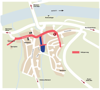 13.00 – 16.30 Uhr wegen Aufstellung des Umzuges am Sportplatz, Verlauf des Festzuges über Hauptstraße bis Einmündung Bergweg – bis zum Auflösen des Festzuges Einmündung zur Traf – weiter über den Wirtschaftsweg bis zur Einmündung in die Industriestraße – Höhe Autohaus Ritter – Anwesen Luxemburger.