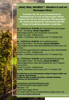 Tel: 06507 6555, Email: touristinfo@neumagen-dhron.de