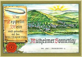 „Der meist getrunkene Wein auf den Fahrten des Grafen Zeppelin“: Das Luftschiff LZ 127 „Graf Zeppelin“ wurde im Jahre 1928 in Betrieb genommen. Im Bordrestaurant zum Essen servierte man dann die „Mülheimer Sonnenlay“.