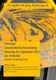 Am Ende der Ausstellung „Fragen an das Sichtbare“ findet ein besonderer Moment des Austauschs statt: Die Finissage findet am 09.09.25 um 19:00 Uhr in der Simultankirche Brauneberg statt. Während der Ausstellungszeit hatten die Besucher:innen Gelegenheit, ihre Gedanken, Assoziationen und Bildtitel zu den Werken von Michael Frank festzuhalten. Diese Rückmeldungen werden nun verlesen und bilden die Grundlage für ein gemeinsames Gespräch. Welche Fragen haben die Bilder aufgeworfen? Welche Deutungen sind entstanden? Und welche Perspektiven eröffnen sich daraus? Die Finissage lädt ein, diesen Dialog zwischen Kunstwerk, Künstler und Publikum weiterzuführen – offen, lebendig und inspirierend.