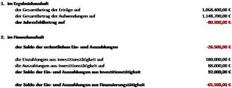 | III. | Der Haushalt 2025 verstößt gegen das Gebot der Sicherung der stetigen Aufgabenerfüllung i.S.v. § 93 Abs. 1 Satz 1 GemO sowie das Haushaltsausgleichsgebot nach § 93 Abs. 4 GemO i.V.m. § 18 GemHVO. Von der Geltendmachung rechtlicher Bedenken wird jedoch abgesehen. Von der Ortsgemeinde Burgen wird im Rahmen der Haushaltsausführung 2025 dennoch erwartet, die Einnahmen und Ausgaben in Einklang zu bringen, um das gesetzlich verpflichtende Gebot des Haushaltsausgleichs einzuhalten. Künftig wird die Vorlage eines operativ ausgeglichen geplanten Haushalts erwartet. |