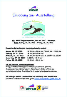 Hiermit lädt die KIRFAM- Familienbildungsfachkraft am Standort Neumagen- Dhron, Carmen Reuter Sie/ Euch herzlich ein, diese Ausstellung in der Zeit vom 24. 10. 2022 - einschl. 28. 10. 2022 im Sozialraum Neumagen- Dhron zu besuchen und einen gemeinsamen Austausch zum Thema zu erfahren. Genauer Ort und Zeiten sind in dem beiliegenden Aushang zu entnehmen.