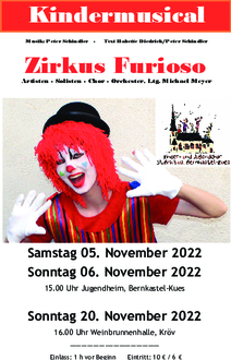 Der Kinder/Jugendchor der Pfarrei St. Briktius, Bernkastel-Kues führt mit einen echten 17 köpfigen Zirkusorchester, vielen Solisten und Artisten das Musical „Zirkus Furioso“ auf.