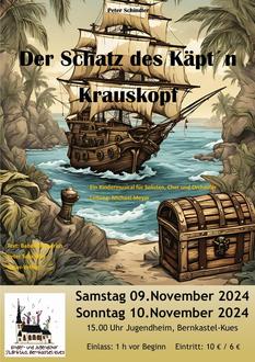 Ein Hauch von Südseeluft und Piratengeschrei wehen am 9. und 10. November durchs Jugendheim: Der Kinder/Jugendchor St. Briktius, Kues führt das Musical „Der Schatz des Käpt’n Krauskopf“ von Peter Schindler auf, eine turbulente Schatzsuche mit überraschendem Ende. Unter der bewährten Leitung von Michael Meyer singen und spielen die Kinder/Jugendchorgruppen des Chorforums St. Briktius, begleitet von einem tollen Orchester.