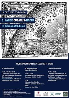 Am 28. Oktober 2023 laden das St. Nikolaus-Hospital, das Cusanus-Geburtshaus und die Mosel-Vinothek sowie das Cusanus-Institut, Trier ab 18.00 Uhr zur Langen Cusanus-Nacht nach Bernkastel-Kues ein. Nach dem Vorbild der ‚Nacht der Museen‘ haben die Veranstalter wieder ein Programm zusammengestellt, das über nächtliche Führungen hinaus viele weitere Highlights bietet.