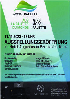 Aus der internationalen Künstlergruppe "La Palette du Monde" haben die ehemaligen deutschen Mitglieder die regionale 'Mosel-Palette' gegründet. Zur ersten Ausstellung laden neun Künstler ins Hotel Augustus in Bernkastel-Kues für Freitag, den 11.11.2023, 18 Uhr, sehr herzlich ein. Die Ausstellung wird täglich von 10 bis 18 Uhr bis Weihnachten zu besichtigen sein, die Exponate können käuflich erworben werden.