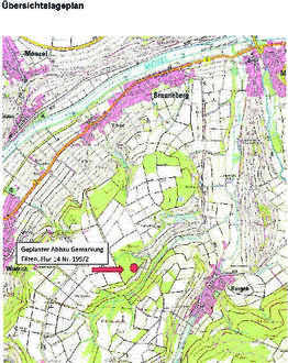 Die Ortsgemeinde Brauneberg ist Eigentümerin der Parzelle Gemarkung Filzen, Flur 14 Flurstück 195/2 auf der Kiesvorkommen bekannt ist. Die Parzelle hat eine Größe von ca. 1,28 ha; das abraumwürdige Kiesvorkommen wird auf ca. 40.000 m* beziffert. Der Abbaustandort liegt ca. 1 km westlich des Ortsrandes von Burgen bzw. 2 km südlich der Ortslage von Brauneberg.