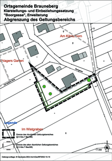 Der korrigierte Entwurf der Klarstellungs- und Einbeziehungssatzung „Boorgasse“, Erweiterung wird auf der Grundlage des Ortsgemeinderatsbeschlusses vom 10.11.2022 gemäß § 3 Abs. 2 i.V.m. § 4 a Abs. 3 Baugesetzbuch (BauGB) verkürzt öffentlich ausgelegt.