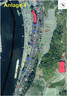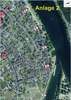 In den Straßen Kardinalstraße, Balduinstraße, Im Brühl und Am Liesch-berg sind durch den Bauhof der Stadt Bernkastel-Kues VZ 250 mit ZZ „Hochwasser“ aufzustellen. An der Kreuzung Schillerstraße/Nikolaus-ufer ist ein Absperrschrankengitter mit 5 dauerhaft leuchtenden roten Warnlampen, VZ 250 und ZZ „Hochwasser“ für die Fahrtrichtung Lieser aufzustellen. (Anlage 2)