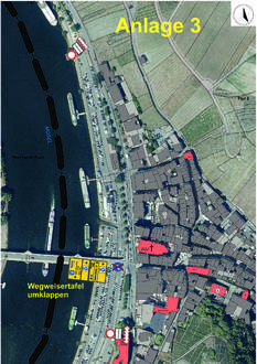 Auf der Moselbrücke ist das VZ 209 „Vorgeschriebene Fahrtrichtung rechts“ abzudecken und die Wegweisertafel umzuklappen. (Anlage 3 + 4)