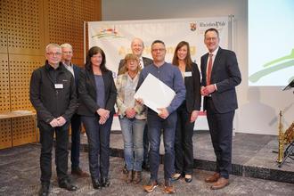 An der Ernennung zur Schwerpunktgemeinde nahmen (v.r.n.l.) teil: Innenminister Michael Ebling, Bürgermeisterin Janine Fischer, Gemeinderatsmitglied und Wehrführer Dirk Weides, Kreisbeigeordneter Rudolf Rinnen, Gemeinderatsmitglieder Ulla Lill und Beth Klankert, Michael Keilen, Sachbearbeiter und der Dorferneuerungs-beauftragte des Eifelkreises Bitburg-Prüm und Edgar Kiewel.