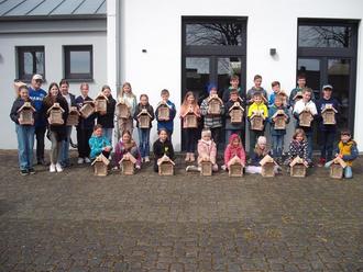 Stolz präsentieren die Kinder und Jugendlichen mit Peter Brixius vom NABU Südeifel ihre Insektenhotels vor dem Messericher Gemeindehaus