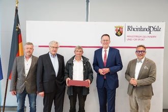 (v. l. n. r. Horst Bares, Ortsbürgermeister, Willi Fink, Beigeordneter der VG, Klaus Peter Grün, Michael Ebling, Innenminister, Michael Ludwig, MdL) MdL) Foto: Innenministerium Rheinland Pfalz