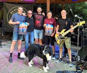 Verantwortlich für das Musikprogramm beim diesjährigen Nimsrock Festival Bernd Lichtenthäler, Michael Klankert, Christian Theisen und Christoph Klankert (v.l.n.r.) mit dem Vorsitzenden des Förderverein Bickendorf hilft Wilfried Kootz (2.v.r.) und Festivalmaskottchen Hund Lucky.