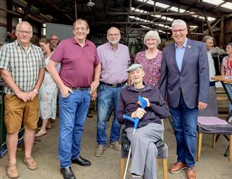 Personen im Bild: v.l.n.r.: Schwiegersohn Gerd Schmidt, 1. Beigeordneter Willi Neisen, Sohn Hans Meyer, Heinrich Meyer, Tochter Elisabeth Schmidt, Ortsbürgermeister Edgar Comes.
