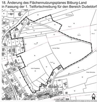 Nachfolgend ist die Abgrenzung des räumlichen Geltungsbereiches des F-Planes in einem unmaßstäblichen Kartenauszug abgedruckt. Dieser Teilbereich ist Gegenstand und Geltungsbereich der 18. FNP-Änderung. Die parzellenscharfe Abgrenzung kann auch im Rathaus der Verbandsgemeinde Bitburger Land (Zimmer 308), Hubert-Prim-Str. 7, 54634 Bitburg, eingesehen werden.