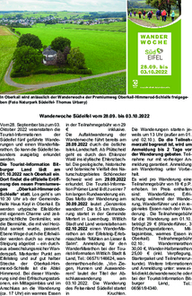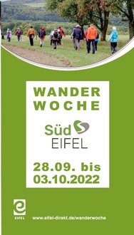 Die Auftaktwanderung der Wanderwoche führt bereits am 28.09.2022 durch die östliche Islek-Landschaft. Ab Plütscheid geht es durch den Ehlenzer Wald ins idyllische Ehlenzbachtal. Die geologische, historische und botanische Vielfalt des Naturschutzgebietes Schönecker Schweiz wird am 29.09.2022 erkundet. Die Tourist-Information Prümer Land lädt zu einer 7 km langen Rundwanderung ein. Das Motto der Wanderung am 30.09.2022 lautet „Genzenlos wandern“. Die 9,5 km Wanderung startet in der Gemeinde Mertert in Luxemburg. Wittlich Stadt und Land veranstalten am 02.10.2022 einen WanderMarathon an der Eifelsteig-Erlebnisschleife "Mühlen an Lieser & Salm". Anmeldung für den WanderMarathon bei der Tourist-Information Wittlich Stadt & Land, Tel.: 06571/146624, wandermarthon-eifel.de. „Von Ziegen, Hunnen und Auswanderern“ lautet der Titel der Abschlusswanderung am 03.10.2022. Die Wanderung des Felsenland Südeifel startet in Kruchten.