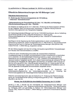Der Verbandsgemeinderat Bitburger Land hat am 16.05.2024 beschlossen, die zur Aufstellung des B-Planes gemäß § 8 Abs. 2 BauGB erforderliche 21. Änderung des Flächennutzungsplanes der VG Kyllburg gemäß § 8 Abs. 3 BauGB im Parallelverfahren durchzuführen.