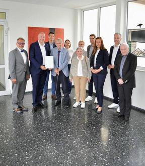 Von links nach rechts: Erster Kreisbeigeordneter Michael Ludwig, Landrat Andreas Kruppert, Herr Peter Schaefer samt Ehefrau Paula Schaefer, Bürgermeisterin Janine Fischer, Landtagsabgeordneter Nico Steinbach und Pater Reinhard Vitt