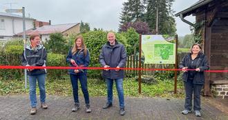 Zum Start der 15,5 km langen Wanderroutezerschnitten VG Bürgermeisterin Janine Fischer, Landrat Andreas Kruppert, Ortsbürgermeisterin Petra Fischer und Maria Arvanitis, Geschäftsführerin der Tourist-Information Bitburger Land, gemeinsam ein rotes Band. Rund 80 Wanderfreunde machten sich, trotz des verregneten Wetters, auf den Weg, um die neue Route zu erkunden.