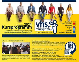 Das neue Kursprogramm der VHS Bitburger Land für das erste Halbjahr 2024 ist nun verfügbar und kann online auf der Homepage www.vhs.bitburgerland.de eingesehen werden. Der gedruckte Programm-Terminflyer ist ebenfalls erhältlich und hier innenliegend.