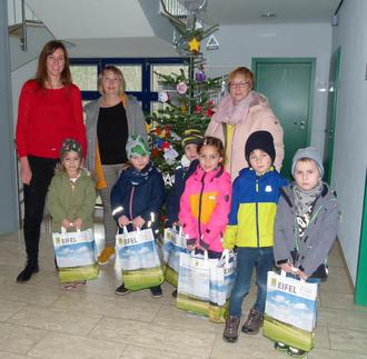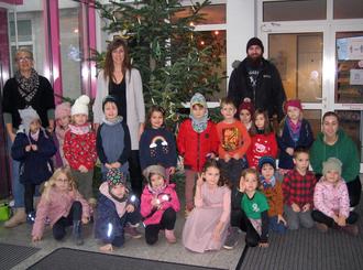 Die Kinder und Betreuer*innen der Kindertagesstätten von Oberkail (Foto oben) und Bickendorf – anlässlich des Weihnachtsbaumschmückens in der Verwaltung – wünschen Ihnen gemeinsam mit Bürgermeisterin Janine Fischer frohe Weihnachten