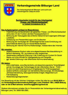 Die Verbandsgemeinde Bitburger Land sucht zum nächstmöglichen Zeitpunkt einen