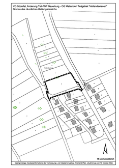 Die Ortsgemeinde Mettendorf beabsichtigt die Aufstellung eines Bebauungsplanes für das Teilgebiet „Hollandswiesen“. Mit der beabsichtigten Planung sollen die bauplanungsrechtlichen Voraussetzungen für die Entwicklung einer Fläche für Gemeinbedarf (Feuerwehrstützpunkt) geschaffen werden. Der Geltungsbereich der Planänderung des Flächennutzungsplanes umfasst folgende Flurgrundstücke der Gemarkung Mettendorf, Flur 15, Flurstücke: 43, 113 und 98 teilweise. Die genaue Abgrenzung des Geltungsbereiches ergibt sich aus dem dieser Bekanntmachung beigefügtem Lageplan.