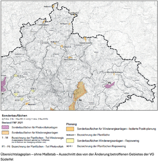 Der derzeit rechtskräftige Flächennutzungsplan der Verbandsgemeinde Südeifel; räumlicher Teilflächennutzungsplan `Neuerburg`, sachlicher Teilflächennutzungsplan „Erneuerbare Energien“ (Windenergie/Photovoltaik) vom 23. April 2021 weist aktuell 6 Sonderbauflächen für Windenergie (Konzentrationszonen) aus. Durch die Ausweisung dieser Flächen entsteht eine Ausschlusswirkung, sodass alle übrigen Bereiche der Verbandsgemeinde planungsrechtlich nicht für weitere Windenergiestandorte zur Verfügung stehen.