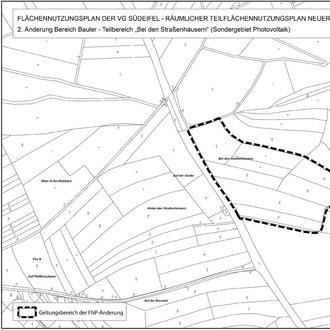 Die Ortsgemeinde Bauler beabsichtigt die Aufstellung eines Bebauungsplanes für das Teilgebiet „Bei den Straßenhäusern“-Sondergebiet Photovoltaik-. Im laufenden Bauleitverfahren wurden die bisherigen erforderlichen bauplanungsrechtlichen Verfahrensschritte durch die Ortsgemeinde vollzogen. Mit der beabsichtigten Planung sollen die bauplanungsrechtlichen Voraussetzungen für die Entwicklung eines Sondergebietes für Photovoltaikanlagen (§ 11 Baunutzungsverordnung (BauNVO)) geschaffen werden. Der Flächennutzungsplan ist in einem Parallelverfahren durch die Verbandsgemeinde Südeifel anzupassen.
