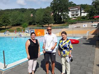 Am 01. August 2022 konnte Badbetriebsleiter Marc Pletat auf 25 Jahre Tätigkeit im öffentlichen Dienst zurückblicken. Nach 24 Jahren in verschiedenen Bädern in und um seine Heimatstadt Bad Pyrmont ist er im Oktober 2021 mit seiner Familie in die Eifel gezogen und seitdem hier bei uns in Bollendorf tätig. Die Ortsgemeinde gratuliert zu diesem Jubiläum ganz herzlich und überraschte Herrn Pletat mit einer Urkunde und einem Präsent. Wir freuen uns sehr auf viele Jahre guter Zusammenarbeit im Freibad Bollendorf.